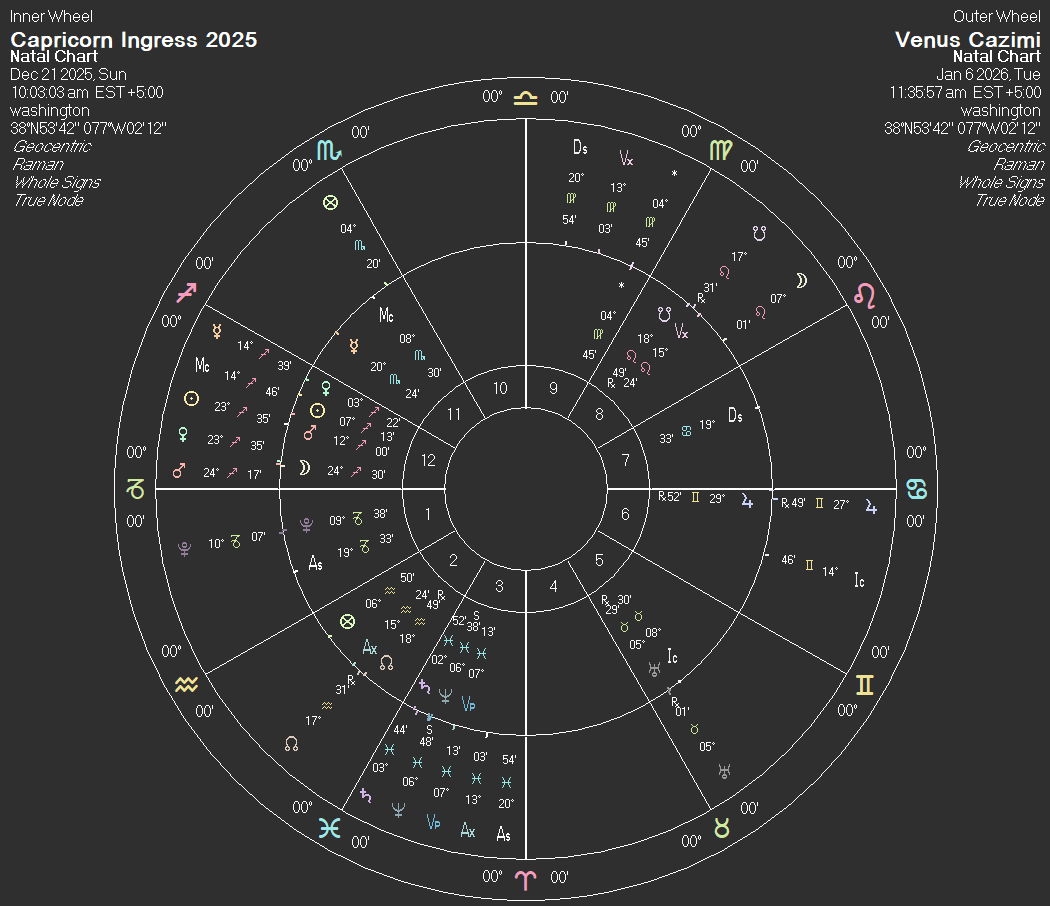 We will be seeing the chaos within the United States continue, while also seeing the ripple the United States actions of war against Venezuela continue to affect innocent people. With the authority significations of this chart, along with themes of power and control, I wouldn’t be surprised to see many countries distance themselves. We have a Venus/Mars Conjunction, then the Mars Cazimi all upcoming within the next week, along with the Virgo Solar Eclipse activation happening around the twelfth of this month.
